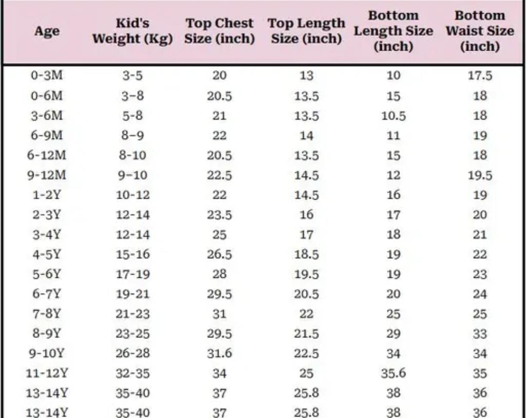 - 3-4 Years (Top Chest Size : 12 null, Top Length Size: 17 null, Bottom Waist Size: 18.5 null, Bottom Length Size: 19 null)